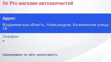 Se-Pro, магазин автозапчастей по адресу Владимирская область, Александров, Калининская улица, 18 в дальнейшем Организация, размещена в следующих категориях: