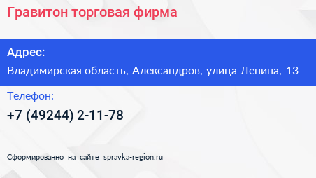 Гравитон, торговая фирма по адресу Владимирская область, Александров, улица Ленина, 13 в дальнейшем Организация, размещена в следующих категориях: