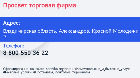 Просвет, торговая фирма по адресу Владимирская область, Александров, Красной Молодёжи, 5 в дальнейшем Организация, размещена в следующих категориях: