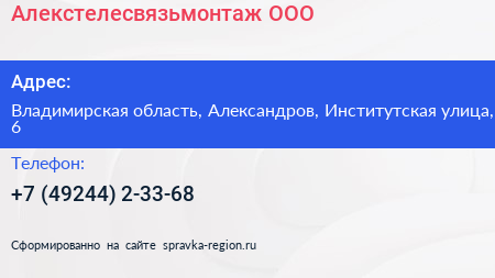 Алекстелесвязьмонтаж, ООО по адресу Владимирская область, Александров, Институтская улица, 6 в дальнейшем Организация, размещена в следующих категориях: