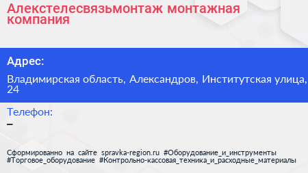 Алекстелесвязьмонтаж, монтажная компания по адресу Владимирская область, Александров, Институтская улица, 24 в дальнейшем Организация, размещена в следующих категориях: