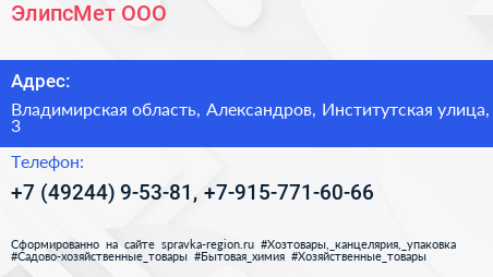 ЭлипсМет, ООО по адресу Владимирская область, Александров, Институтская улица, 3 в дальнейшем Организация, размещена в следующих категориях: