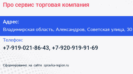 Про-сервис, торговая компания по адресу Владимирская область, Александров, Советская улица, 30 в дальнейшем Организация, размещена в следующих категориях: