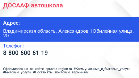 ДОСААФ, автошкола по адресу Владимирская область, Александров, Юбилейная улица, 20 в дальнейшем Организация, размещена в следующих категориях: