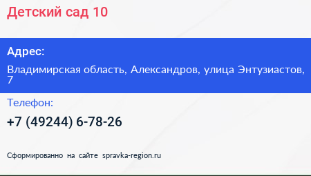 Детский сад №10 по адресу Владимирская область, Александров, улица Энтузиастов, 7 в дальнейшем Организация, размещена в следующих категориях: