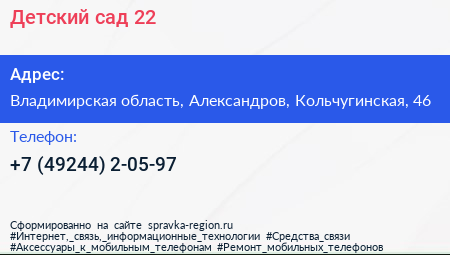 Детский сад №22 по адресу Владимирская область, Александров, Кольчугинская, 46 в дальнейшем Организация, размещена в следующих категориях: