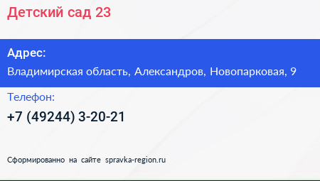 Детский сад №23 по адресу Владимирская область, Александров, Новопарковая, 9 в дальнейшем Организация, размещена в следующих категориях: