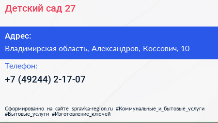 Детский сад №27 по адресу Владимирская область, Александров, Коссович, 10 в дальнейшем Организация, размещена в следующих категориях: