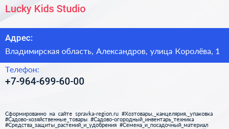 Lucky Kids Studio по адресу Владимирская область, Александров, улица Королёва, 1 в дальнейшем Организация, размещена в следующих категориях: