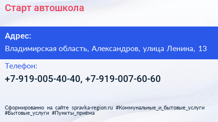 Старт, автошкола по адресу Владимирская область, Александров, улица Ленина, 13 в дальнейшем Организация, размещена в следующих категориях:
