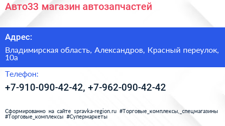 Авто33, магазин автозапчастей по адресу Владимирская область, Александров, Красный переулок, 10а в дальнейшем Организация, размещена в следующих категориях:
