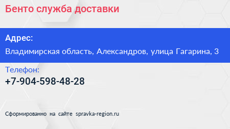 Бенто, служба доставки по адресу Владимирская область, Александров, улица Гагарина, 3 в дальнейшем Организация, размещена в следующих категориях: