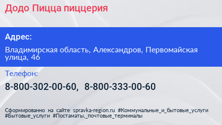 Додо Пицца, пиццерия по адресу Владимирская область, Александров, Первомайская улица, 46 в дальнейшем Организация, размещена в следующих категориях: