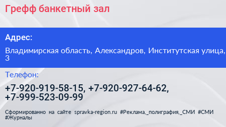 Грефф, банкетный зал по адресу Владимирская область, Александров, Институтская улица, 3 в дальнейшем Организация, размещена в следующих категориях: