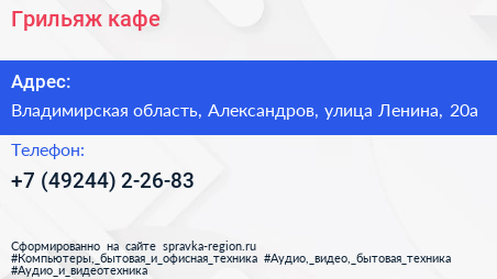 Грильяж, кафе по адресу Владимирская область, Александров, улица Ленина, 20а в дальнейшем Организация, размещена в следующих категориях: