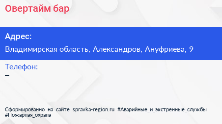 Овертайм, бар по адресу Владимирская область, Александров, Ануфриева, 9 в дальнейшем Организация, размещена в следующих категориях: