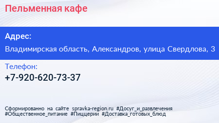 Пельменная, кафе по адресу Владимирская область, Александров, улица Свердлова, 3 в дальнейшем Организация, размещена в следующих категориях: