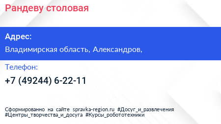 Рандеву, столовая по адресу Владимирская область, Александров, в дальнейшем Организация, размещена в следующих категориях: