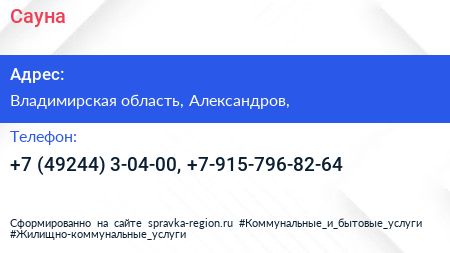 Сауна по адресу Владимирская область, Александров, в дальнейшем Организация, размещена в следующих категориях:
