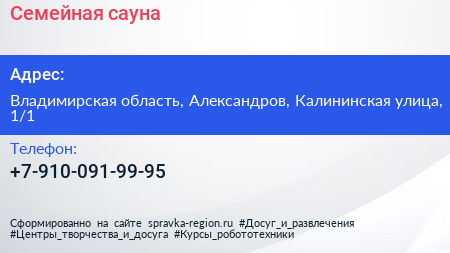 Семейная сауна по адресу Владимирская область, Александров, Калининская улица, 1/1 в дальнейшем Организация, размещена в следующих категориях: