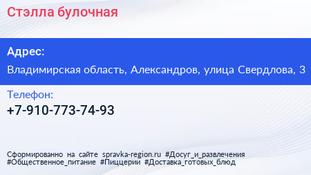 Стэлла, булочная по адресу Владимирская область, Александров, улица Свердлова, 3 в дальнейшем Организация, размещена в следующих категориях: