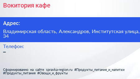 Вокитория, кафе по адресу Владимирская область, Александров, Институтская улица, 34 в дальнейшем Организация, размещена в следующих категориях: