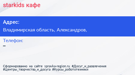 starkids, кафе по адресу Владимирская область, Александров, в дальнейшем Организация, размещена в следующих категориях: