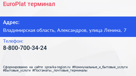 EuroPlat, терминал по адресу Владимирская область, Александров, улица Ленина, 7 в дальнейшем Организация, размещена в следующих категориях: