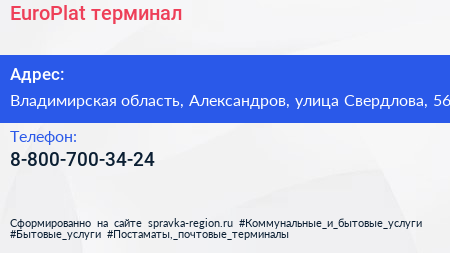 EuroPlat, терминал по адресу Владимирская область, Александров, улица Свердлова, 56 в дальнейшем Организация, размещена в следующих категориях: