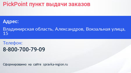 PickPoint, пункт выдачи заказов по адресу Владимирская область, Александров, Вокзальная улица, 15 в дальнейшем Организация, размещена в следующих категориях: