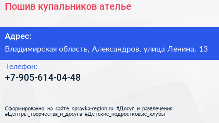 Пошив купальников, ателье по адресу Владимирская область, Александров, улица Ленина, 13 в дальнейшем Организация, размещена в следующих категориях: