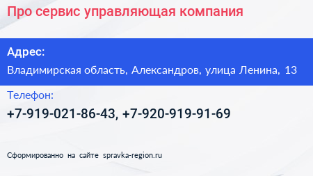 Про-сервис, управляющая компания по адресу Владимирская область, Александров, улица Ленина, 13 в дальнейшем Организация, размещена в следующих категориях: