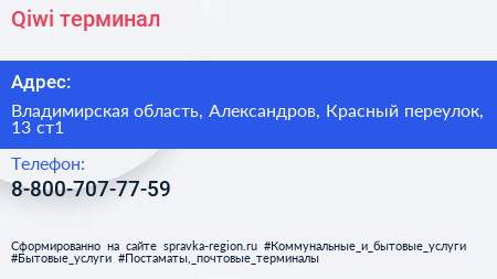Qiwi, терминал по адресу Владимирская область, Александров, Красный переулок, 13 ст1 в дальнейшем Организация, размещена в следующих категориях: