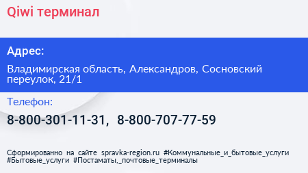 Qiwi, терминал по адресу Владимирская область, Александров, Сосновский переулок, 21/1 в дальнейшем Организация, размещена в следующих категориях: