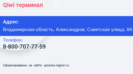 Qiwi, терминал по адресу Владимирская область, Александров, Советская улица, 84 в дальнейшем Организация, размещена в следующих категориях: