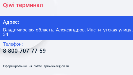 Qiwi, терминал по адресу Владимирская область, Александров, Институтская улица, 34 в дальнейшем Организация, размещена в следующих категориях: