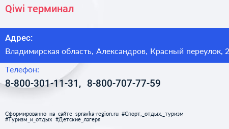 Qiwi, терминал по адресу Владимирская область, Александров, Красный переулок, 2 в дальнейшем Организация, размещена в следующих категориях: