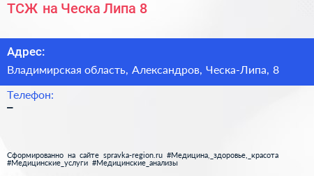 ТСЖ на Ческа Липа 8 по адресу Владимирская область, Александров, Ческа-Липа, 8 в дальнейшем Организация, размещена в следующих категориях: