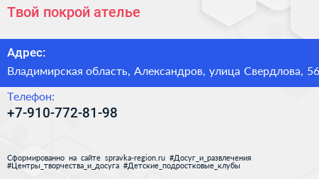 Твой покрой, ателье по адресу Владимирская область, Александров, улица Свердлова, 56 в дальнейшем Организация, размещена в следующих категориях: