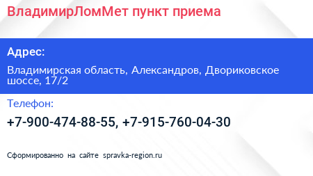 ВладимирЛомМет, пункт приема по адресу Владимирская область, Александров, Двориковское шоссе, 17/2 в дальнейшем Организация, размещена в следующих категориях: