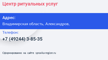 Центр ритуальных услуг по адресу Владимирская область, Александров, в дальнейшем Организация, размещена в следующих категориях: