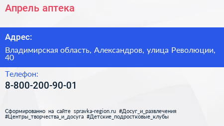 Апрель, аптека по адресу Владимирская область, Александров, улица Революции, 40 в дальнейшем Организация, размещена в следующих категориях: