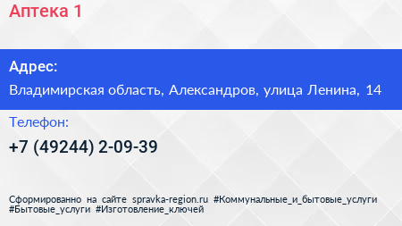 Аптека №1 по адресу Владимирская область, Александров, улица Ленина, 14 в дальнейшем Организация, размещена в следующих категориях: