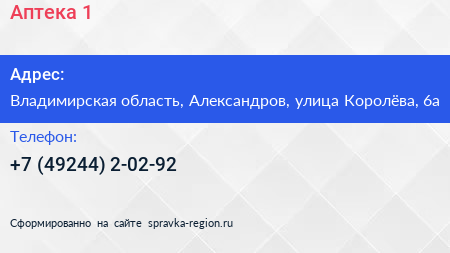 Аптека №1 по адресу Владимирская область, Александров, улица Королёва, 6а в дальнейшем Организация, размещена в следующих категориях: