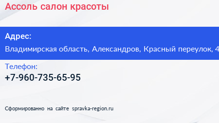 Ассоль, салон красоты по адресу Владимирская область, Александров, Красный переулок, 4 в дальнейшем Организация, размещена в следующих категориях: