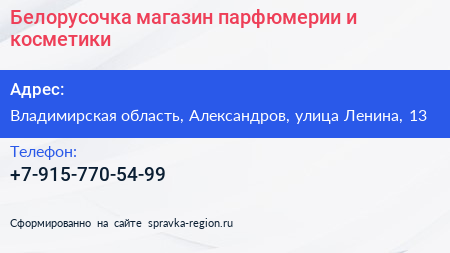 Белорусочка, магазин парфюмерии и косметики по адресу Владимирская область, Александров, улица Ленина, 13 в дальнейшем Организация, размещена в следующих категориях: