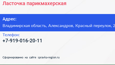 Ласточка, парикмахерская по адресу Владимирская область, Александров, Красный переулок, 2 в дальнейшем Организация, размещена в следующих категориях:
