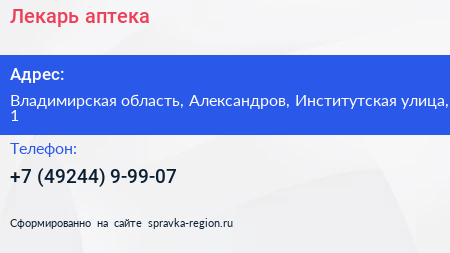 Лекарь, аптека по адресу Владимирская область, Александров, Институтская улица, 1 в дальнейшем Организация, размещена в следующих категориях: