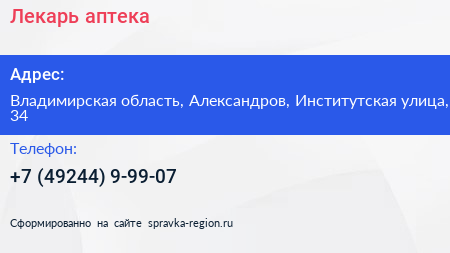 Лекарь, аптека по адресу Владимирская область, Александров, Институтская улица, 34 в дальнейшем Организация, размещена в следующих категориях: