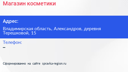 Магазин косметики по адресу Владимирская область, Александров, деревня Терешковой, 15 в дальнейшем Организация, размещена в следующих категориях: